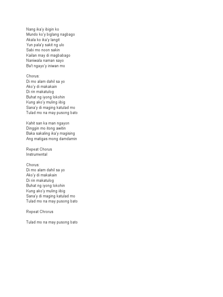 Halos limang oras na akong nag-aantay sa iyo Nag-aabang ako sa labas ng bahay niyo Sipat ng sipat kung sisilip ka ba sa bintana Magpakita kay parang di yata Ilang beses ka nang lagi na lang ganyan Kung iwasan akoy parang ayaw akong nandyan Sa susunod na punta koy pagbuksan mo na sana Kase kahit anong mangyari ay di ako mawawalan ng pag-asa. Pagmamahal ko sayoy tapat. Dahil sayo ang buhay ko ay nag bago letra Canciones con dahil sayo ang buhay ko ay nag bago por letras todas las canciones de dahil sayo ang buhay ko ay nag bagoVe la lista de todas las canciones viejas y nuevas con letras de dahil sayo ang buhay ko ay nag bago directas de nuestro buscador y escuchalas online.
